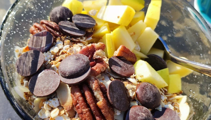 2° Couper la pomme soit en cubes soit en lamelles. Dans un bol, verser le yaourt, ajouter dessus le granola. Ajouter les pistoles de chocolat puis les morceaux de pommes.