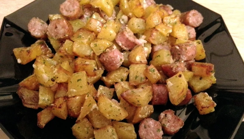 5° Coupez les saucisses en grosses rondelles et ajoutez-les à la poêlée une fois que les pommes de terre sont croustillantes.