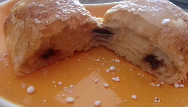 4° Enroulez chaque extrémité vers le centre du rectangle, jointez puis retournez la chocolatine de l'autre côté, pour éviter qu'elle ne s'ouvre lors de la cuisson.