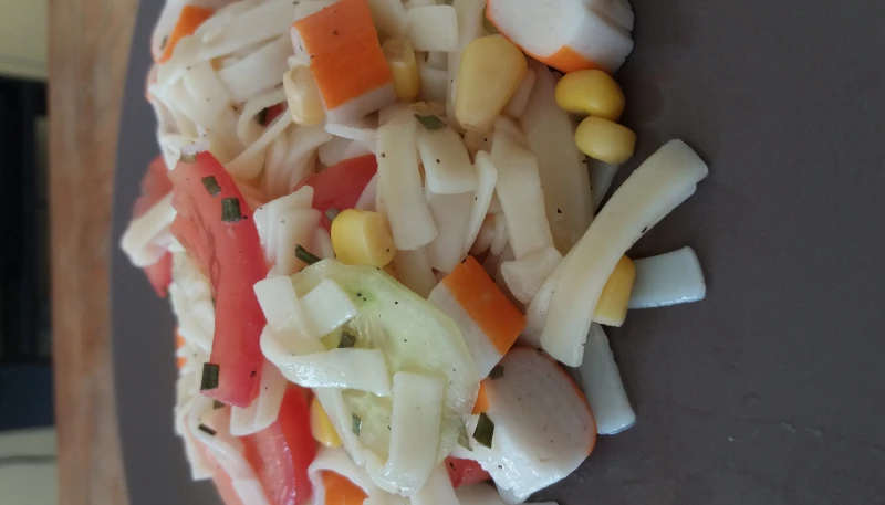 Dans un saladier, mélanger les pâtes avec les cubes de tomate, le concombre, le maïs, le surimi et la sauce.