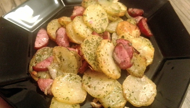7° Terminez en ajoutant la saucisse et laissez rôtir la poêlée encore quelques minutes.