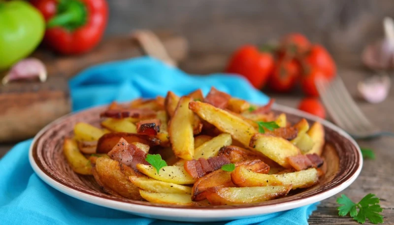 1° Lavez et coupez les panais en forme de frites. Coupez le bacon en allumettes.