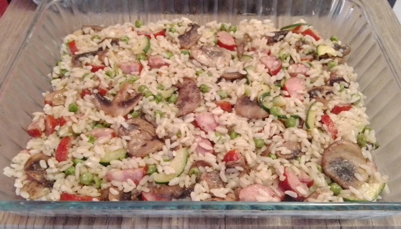 5° Dans une sauteuse, versez le riz, les champignons, la courgette, les saucisses et les petits pois. Mélangez.