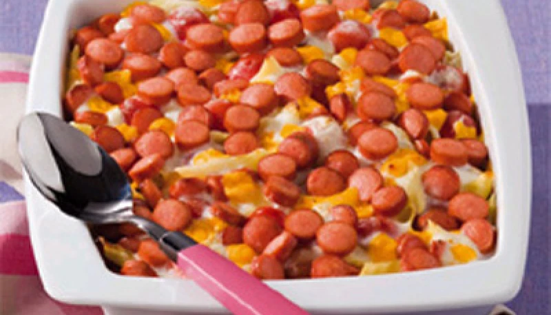 - une fois les pâtes cuites, mettez-y les saucisses et la sauce tomate!