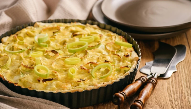 6° Piquez la pâte avec une fourchette, puis disposez-la sur les poireaux. Mettre au four et cuire pendant 25 minutes.