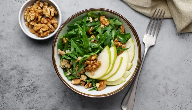 7° Dégustez la salade de roquette, poires et fromage de chèvre.