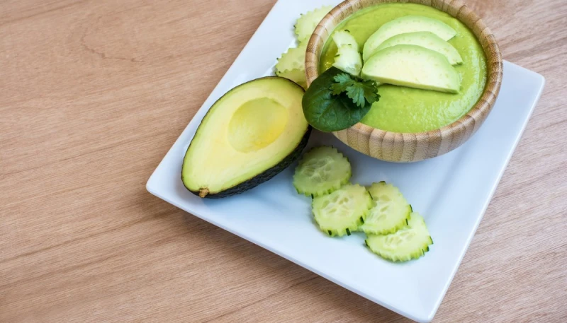 2° Dans un blender, ajoutez le concombre, les avocats, le jus de citron, l'huile d'olive, la gousse d'ail pelée, le persil effeuillé, le sel et le poivre. Mixez le tout.