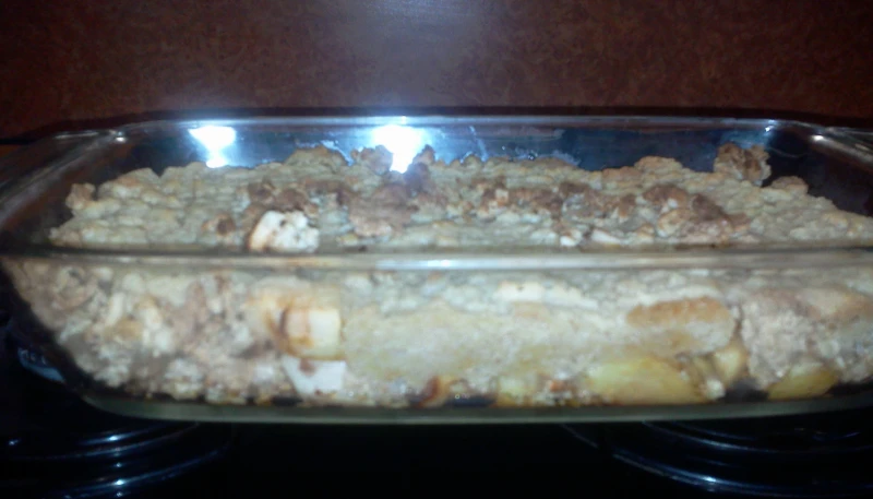 Dans un plat à gratin, disposer les dés de pomme puis la pâte à crumble.