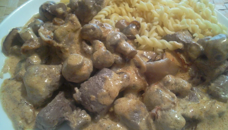 Une fois le temps écoulé, ajouter les champignons et cuire encore 5 min, puis mettre le reste de beurre et d'huile dans la poêle et faire cuire les morceaux de boeuf (ou le rumsteak ) à feu moyen pendant 2-3 min, avant d'ajouter le mélange moutarde-tomate-citron et de laisser cuire 2 min, puis de verser la crème liquide pour la faire revenir 2 min.